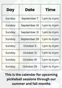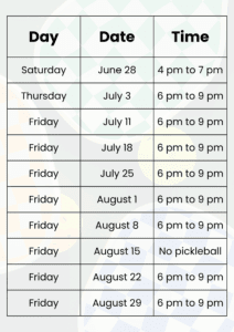 Please note the new calendar for pickleball dates and times for the summer and fall months: